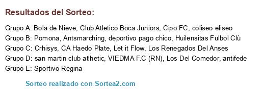 Lista de participantes: Let it Flow, Club Atletico Boca Juniors, VIEDMA F.C (RN), antifede, coliseo eliseo, deportivo pago chico, Pomona, san martin club atlhetic, Antsmarching, Cipo FC, CA Haedo Plate, Sportivo Regina, Los Del Comedor, Crhisys, Los Renegados Del Anses, Bola de Nieve, Huilensitas Fulbol Clù.