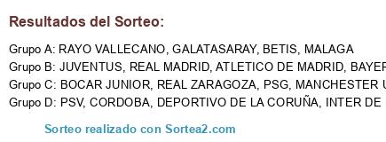 Lista de participantes: REAL MADRID, PSG, CORDOBA, MALAGA, RAYO VALLECANO, INTER DE MILAN, GALATASARAY, BOCAR JUNIOR, BAYERN MUNICH, BETIS, ATLETICO DE MADRID, PSV, JUVENTUS, MANCHESTER UNITED, REAL ZARAGOZA, DEPORTIVO DE LA CORUÑA.