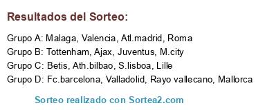 Lista de participantes: M.city, Roma, Ajax, Valladolid, Rayo vallecano, Lille, Fc.barcelona, Malaga, S.lisboa, Mallorca, Tottenham, Betis, Atl.madrid, Valencia, Ath.bilbao, Juventus.