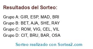 Lista de participantes: BRI, VIL, VIG, AJA, BAR, BRU, GIR, ESP, RAY, ROM, MAD, OSA, CIT, BET, SHE, CEL.