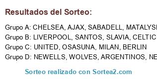 Lista de participantes: WOLVES, UNITED, LIVERPOOL, SANTOS, OSASUNA, MILAN, SLAVIA, BERLIN, MATALYSPOR, SABADELL, CELTIC, NEWELLS, NEWCASTLE, AJAX, ARGENTINOS, CHELSEA.