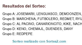 Lista de participantes: DUENDES, AL PACINO, REDMET, OSWORLF, CANARIONCITO, JOSEMARII, NACHO, KENO, DEMOONZEN, RYUSIPA, REDPEPE, LENGUASCO, FUTBOLERO, MARCHENA, KIKE, DANY, CHEMAJL.