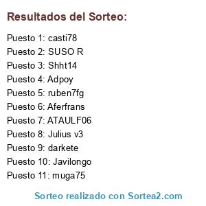 Lista de participantes: Aferfrans, Adpoy, Julius v3, ATAULF06, Shht14, muga75, SUSO R, Javilongo, darkete, casti78, ruben7fg.