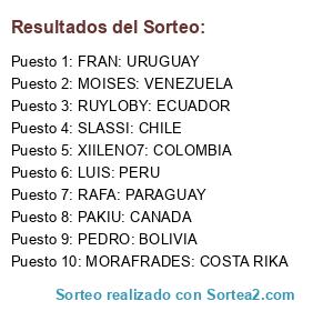 Lista de participantes: ARGENTINA: manolozon, BOLIVIA: sanmaa, BRASIL: poliny, CHILE: Naranjito82, COLOMBIA: Namukai360, ECUADOR: gabripf, ESTADOS UNIDOS: izenbako123, MÉXICO: fitohipi, PARAGUAY: SergioCollado, PERÚ: TurfyTomas, URUGUAY: SeRgyo2011, VENEZUELA: DAVILON69.