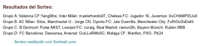 Lista de participantes: Valencia CF:Yang08re, PSG: Piti24, Juventus: XxCHAMPIDJxX, Real Madrid: ramon26i, Manchester U.: Jorge CN, B.Dormunt: Pulse AKST, Oporto FC: Jaix Guerrilla, Malaga CF: Manllon, Arsenal: GuiLLeRMoSC, Bayern Munich: Rubén RBB, AC Milan: Sitos, FC Barcelona: Descansa, Chelsea FC: Jugador 16, Liverpol FC: coraig, Inter Milán: masterhands07, Manchester City: FuRiOuSxDaNi.