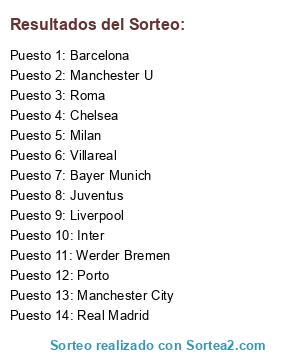 Lista de participantes: Barcelona, Bayer Munich, Chelsea, Inter, Juventus, Liverpool , Manchester City, Manchester U, Milan, Porto, Real Madrid, Roma, Villareal, Werder Bremen.