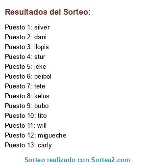 Lista de participantes: bubo, carly, jeke, tete, kelus, llopis, silver, tito, will, dani, peibol, stur, migueche.