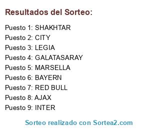 Lista de participantes: SHAKHTAR, CITY, AJAX, MARSELLA, INTER, GALATASARAY, RED BULL, LEGIA, BAYERN.