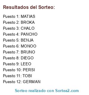 Lista de participantes: pancho, jona, matias, german, bruno, monipo, diego, leooo, benja, chalo, persi, tobi.