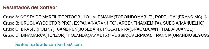 Lista de participantes: BRASIL (POLINY), ALEMANIA(TOROINDOMABLE), INGLATERRA(CRACKDOWN), SUECIA(MANUELHO), NIGERIA(IZENBAKO), FRANCIA(GRANDIOSEGUSS), HOLANDA(JAYMETX), ITALIA(JUANEE), DINAMARCA(TENZOR), ARGENTINA(XEMITA), COSTA DE MARFIL(PEPITOGRILLO), ESPAÑA(NARANJITO), CAMERUN(JOSEBARI), RUSSIA(OVERPICK), URUGUAY(DOCTOR PRO), PORTUGAL(FRANCIMC).