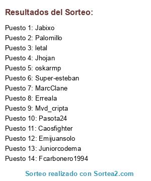 Lista de participantes: Mvd_cripta, Super-esteban, Emijuansolo, Pasota24, Palomillo, Erreala, Juniorcodema, Jhojan, letal, Jabixo, MarcClane, Caosfighter, oskarmp, Fcarbonero1994.