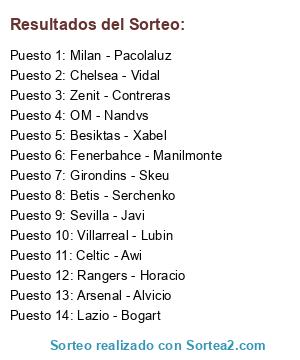 Lista de participantes: Milan - Pacolaluz, Celtic - Awi, Girondins - Skeu, Chelsea - Vidal, Arsenal - Alvicio, Rangers - Horacio, Zenit - Contreras, Villarreal - Lubin, Besiktas - Xabel, Lazio - Bogart, OM - Nandvs, Sevilla - Javi, Betis - Serchenko, Fenerbahce - Manilmonte.