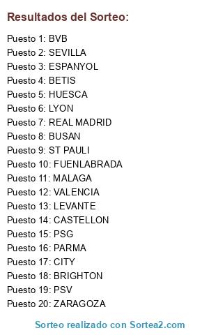 Lista de participantes: VALENCIA, SEVILLA, CASTELLON, BUSAN, CITY, ESPANYOL, FUENLABRADA, MALAGA, ST PAULI, ZARAGOZA, HUESCA, REAL MADRID, BETIS, PSG, PARMA, BRIGHTON, LYON, LEVANTE, BVB, PSV.