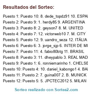 Lista de participantes: Puesto 1: 6. ronniemarinho 1. CHELSEA, Puesto 2: 7. guina007 2. B. MUNICK, Puesto 3: 11. dheypablo 3. REAL MADRID, Puesto 4: 10. daniel_kabongo1 4. BARCELONA, Puesto 5: 5. JPCTEC2012 5. MILAN, Puesto 6: 3. jorge_sjp 6. INTER DE MILÃO, Puesto 7: 12. victorweb10 7. M. CITY, Puesto 8: 2. geyson7 8. M. UNITED, Puesto 9: 1. herdy85 9. ARGENTINA, Puesto 10: 8. dede_topdz91 10. ESPANHA, Puesto 11: 4. fabio80btg 11. BRASIL, Puesto 12: 9. uandro_seza 12. ITÁLIA.