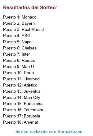 Lista de participantes: Real Madrid, PSG, Barcelona, Bayern, Chelsea, Juventus, Man U, Atletico, Man City, Tottenham, Arsenal, Borussia, Napoli, Liverpool, Monaco, Romas, Porto, Inter.
