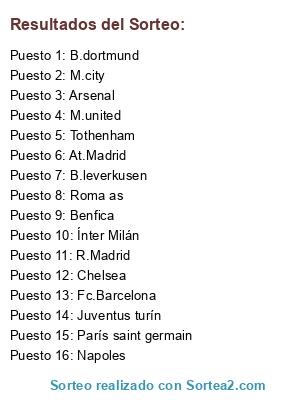 Lista de participantes: París saint germain, Juventus turín, At.Madrid, R.Madrid, Fc.Barcelona, M.city, M.united, Tothenham, Roma as, Napoles, Ínter Milán, B.dortmund, Arsenal, Chelsea, B.leverkusen, Benfica.