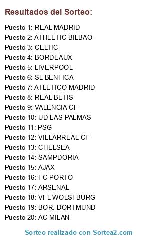 Lista de participantes: ATLETICO MADRID, SAMPDORIA, BORDEAUX, REAL MADRID, VALENCIA CF, ATHLETIC BILBAO, REAL BETIS, CHELSEA, BOR. DORTMUND, FC PORTO, PSG, UD LAS PALMAS, VILLARREAL CF, VFL WOLSFBURG, LIVERPOOL, SL BENFICA, ARSENAL, AC MILAN, CELTIC, AJAX.