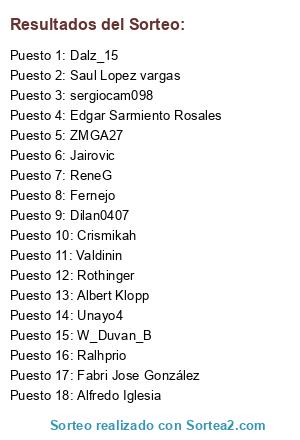 Lista de participantes: Ralhprio, Dilan0407, Jairovic, Fabri Jose González, Alfredo Iglesia, sergiocam098, W_Duvan_B, Dalz_15, Valdinin, Saul Lopez vargas, Edgar Sarmiento Rosales, ZMGA27, ReneG, Crismikah, Unayo4, Fernejo, Rothinger, Albert Klopp.