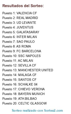 Lista de participantes: AS ROMA, MANCHESTER UNITED, INTER MILAN, AC MILAN, VALENCIA CF, GALATASARAY, JUVENTUS, SSC NAPOLES, SCHALKE 04, SANTOS CF, CELTIC GLASGOW, REAL MADRID, ATH.BILBAO, MALAGA CF, FC BARCELONA, SEVILLA CF, UD LEVANTE, SAO PAULO, BAYERN MUNICH, CHIEVO VERONA.