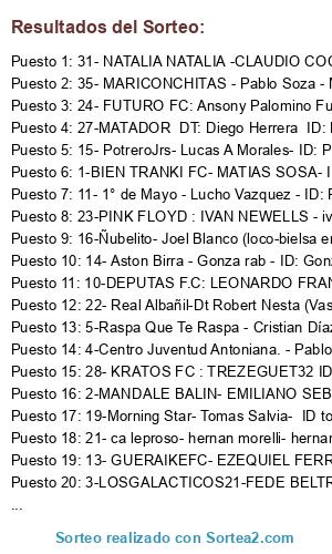 Lista de participantes: 1-BIEN TRANKI FC- MATIAS SOSA- ID: BIENTRANQUIFC, 2-MANDALE BALIN- EMILIANO SEBASTIAN- ID EMOBOCA, 3-LOSGALACTICOS21-FEDE BELTRANDO-ID: LOSGALACTICOS21, 4-Centro Juventud Antoniana. - Pablo Luciano -ID:pablo_CJA, 5-Raspa Que Te Raspa - Cristian Díaz - ID: AguiluchoComRiv, 6-Argentino (R) - Mariano Castellano - ID: Argentino de Rosario, 7-JAH LOVE FC - PABLO VAZQUEZ - ID: JAH_LOVE_FC, 8-DIAVOLO FC : MARCELO FERNANDEZ- ID: marcelo_98-01, 9-riverpool fc : lucas venialgo . ID: lautaro09, 10-DEPUTAS F.C: LEONARDO FRANCISCO BONATTI ID: LEOARGENTOMDQ, 11- 1° de Mayo - Lucho Vazquez - ID: Primero_de_Mayo, 12- FC14MILLONES -- DT VIYO DIAZ --- ID:FC14MILLONES, 13- GUERAIKEFC- EZEQUIEL FERRO- ID: GUERAIKEFC, 14- Aston Birra - Gonza rab - ID: Gonzarab, 15- PotreroJrs- Lucas A Morales- ID: PotreroJrs, 16-Ñubelito- Joel Blanco (loco-bielsa en foro)- ID: NIUBELITO, 17-Desamparados de haedo - Ezequiel Dominguez - id desamparadosfc, 18-ARAGUA FC Santiago Fernandez ID santo__77, 19-Morning Star- Tomas Salvia- ID tomasmorning, 20- ATLETICO NACIONAL- eliocr- eliocabj, 21- ca leproso- hernan morelli- hernan1973-, 22- Real Albañil-Dt Robert Nesta (VascoHaedo)- ID en tramite, 23-PINK FLOYD : IVAN NEWELLS - ivanovik_10, 24- FUTURO FC: Ansony Palomino Fuentes ID: palo30mino-, 25-DEPORTIVO LAFE Omar Aviles ID: deportivolafe, 26- LOS FORZOSOS DE ALMAGRO FACE: GABRIEL MANZO ID: LOS_FORZOSOS_D_A, 27-MATADOR DT: Diego Herrera ID: DIEGOTIGRE-PCA, 28- KRATOS FC : TREZEGUET32 ID VAMOSROJO2012, 29- MUCHACHOTA FC- DT SEBASDZIE ID SEBASDZIE, 30-Roman Lennon- Sergio Pereira- ID CA-ROMAN-LENNON, 31- NATALIA NATALIA -CLAUDIO COCA- AYRJAZ, 32- ME TOMOUNAGAROMPA - franco mojica- franco_canob74, 33-DEFENSOR SPORTING -elcorcho, 34- Vende humo Daniel Altamirano id vende--humo, 35- MARICONCHITAS - Pablo Soza - MAR-ICONCHITAS, 36-C.A.TURU TURU1011, 37-PATRICIO REY - Eduardo Messagli - ID: Messagli.