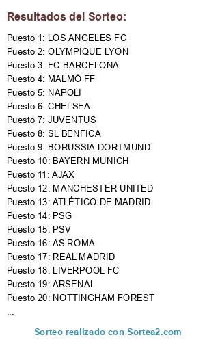 Lista de participantes: FC BARCELONA, MANCHESTER CITY, MANCHESTER UNITED, REAL MADRID, PSG, OLYMPIQUE LYON, ARSENAL, BAYERN MUNICH, LIVERPOOL FC, JUVENTUS, BORUSSIA DORTMUND, AJAX, AS ROMA, SL BENFICA, CHELSEA, NOTTINGHAM FOREST, MALMÖ FF, LOS ANGELES FC, ATLÉTICO DE MADRID, NAPOLI, PSV.