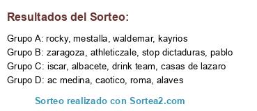Lista de participantes: ac medina, kayrios, casas de lazaro, albacete, alaves, mestalla, iscar, roma, pablo, caotico, rocky, zaragoza, athleticzale, waldemar, stop dictaduras, drink team.