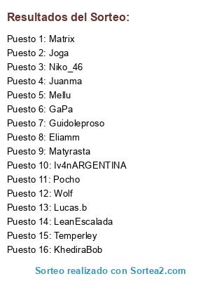 Lista de participantes: Lucas.b , Pocho , Guidoleproso , Matyrasta , Wolf , GaPa , Eliamm , Matrix, Joga, LeanEscalada , Temperley, Juanma , Niko_46 , Mellu , KhediraBob , Iv4nARGENTINA.