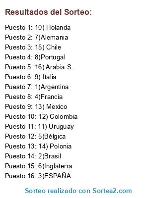 Lista de participantes: 1)Argentina, 2)Brasil, 3)ESPAÑA, 4)Francia, 5)Bélgica, 6)Inglaterra, 7)Alemania, 8)Portugal, 9) Italia, 10) Holanda, 11) Uruguay, 12) Colombia, 13) Mexico, 14) Polonia, 15) Chile, 16) Arabia S..