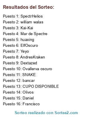 Lista de participantes: SNAKE, Olivos, CUPO DISPONIBLE, huaxing, Francisco, SpectrHelios, ElfOscuro, AndresKraken, Daniel, Mar de Spectre, Dextazed, Ovallerva oscuro, Yeyo, bancar, william walas, Kai-Kai.