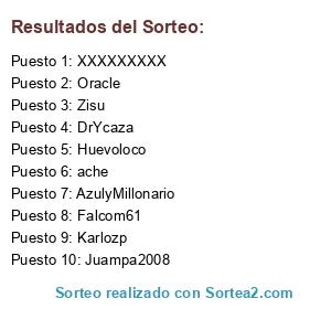 Lista de participantes: DrYcaza, Zisu, Oracle, Huevoloco, Falcom61, ache, AzulyMillonario, Juampa2008, Karlozp, XXXXXXXXX.