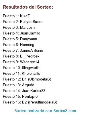 Lista de participantes: Honning, JuanCamilo, Peritapro, Walterex14, JuanKarlox83, Danysann, Argudo, KikeZ, Kholoncillo, B2 (PenultimodelaB), JaimeAntonio, B1 (UltimodelaB), BullydeSucre, Illingworth, El_Pedroski, Marcosh.
