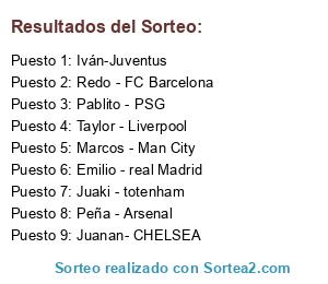 Lista de participantes: Pablito - PSG, Iván-Juventus, Taylor - Liverpool, Marcos - Man City, Redo - FC Barcelona, Emilio - real Madrid, Peña - Arsenal, Juaki - totenham, Juanan- CHELSEA.
