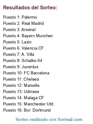 Lista de participantes: A. Villa, Manchester Utd., Arsenal, Chelsea, Real Madrid, FC Barcelona, Malaga CF, Valencia CF, Juventus, Lazio, Udinese, Palermo, Bayern Munchen, Bor. Dortmund, Marsella, Schalke 04.