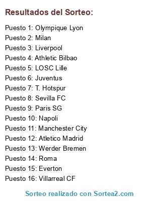 Lista de participantes: Manchester City, T. Hotspur, Liverpool, Everton, Atletico Madrid, Sevilla FC, Athletic Bilbao, Villarreal CF, Roma, Milan, Napoli, Juventus, Olympique Lyon, Paris SG, LOSC Lille, Werder Bremen.