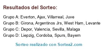 Lista de participantes: Levante, Spurs, Villarreal, Juve, Everton, West Ham, Bayern, Malaga, Depor, Argentinos Jrs, Valencia, Liepzig, Sevilla, Cordoba, Ajax, Girona.