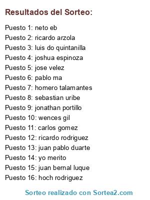 Lista de participantes: carlos gomez, ricardo rodriguez, yo merito, pablo ma, juan pablo duarte, neto eb, luis do quintanilla, homero talamantes, juan bernal luque, jonathan portillo, sebastian uribe, jose velez, joshua espinoza, wences gil, ricardo arzola, hoch rodriguez.