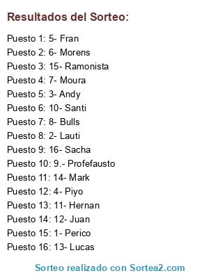 Lista de participantes: 1- Perico, 2- Lauti, 3- Andy, 4- Piyo, 5- Fran, 6- Morens, 7- Moura, 8- Bulls, 9.- Profefausto, 10- Santi, 11- Hernan, 12- Juan, 13- Lucas, 14- Mark, 15- Ramonista, 16- Sacha.