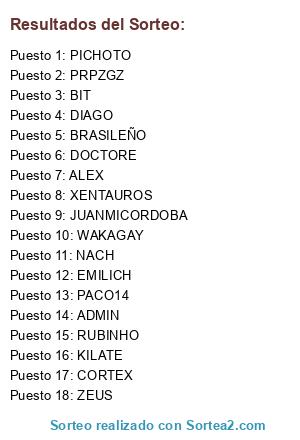 Lista de participantes: ADMIN, PRPZGZ, BRASILEÑO, JUANMICORDOBA, PACO14, DOCTORE, ZEUS, EMILICH, PICHOTO, CORTEX, ALEX, DIAGO, WAKAGAY, RUBINHO, XENTAUROS, BIT, NACH, KILATE.