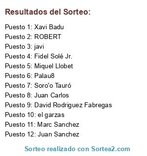 Lista de participantes: javi, Marc Sanchez, Fidel Solé Jr., Juan Sanchez, Palau8, el garzas, ROBERT, Soro'o Tauró, Juan Carlos, Miquel Llobet, David Rodriguez Fabregas, Xavi Badu.