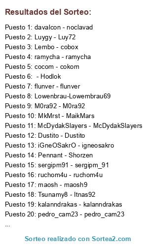 Lista de participantes: Tsunamy8 - Itnas92, McDydakSlayers - McDydakSlayers, iGneOSakrO - igneosakro, <> - Hodlok, maosh - maosh9, kalanndrakas - kalanndrakas, joako357 - joako357, Prodboy - Prodboy85, Lembo - cobox, Pennant - Shorzen, SamTN77 - SamTN77, MkMrst - MaikMars, davalcon - noclavad, ruchom4u - ruchom4u, Dustito - Dustito, Luygy - Luy72, Lowenbrau-Lowembrau69, M0ra92 - M0ra92, cocom - cokom, ramycha - ramycha, sergipm91 - sergipm_91, xecollons - Eugeni23, flunver - flunver, pedro_cam23 - pedro_cam23.