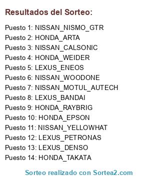 Lista de participantes: LEXUS_PETRONAS, LEXUS_ENEOS, NISSAN_CALSONIC, HONDA_RAYBRIG, NISSAN_NISMO_Z, HONDA_ARTA, HONDA_TAKATA, NISSAN_WOODONE, NISSAN_MOTUL_AUTECH, HONDA_WEIDER, NISSAN_YELLOWHAT, LEXUS_DENSO, NISSAN_NISMO_GTR, LEXUS_BANDAI, HONDA_EPSON.