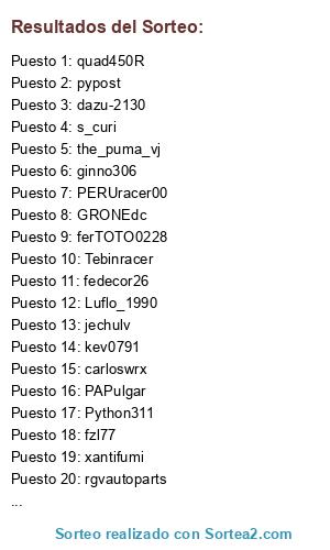 Lista de participantes: the_puma_vj, dazu-2130, Tebinracer, mickmalfer, xantifumi, PAPulgar, GRONEdc, s_curi, pypost, fedecor26, PERUracer00, rgvautoparts, quad450R, Python311, Bombardero77, Luflo_1990, Zulu_11, jechulv, fzl77, pocho200, donlucho81, guerra86obg, kev0791, PTY-Rubn23, ferTOTO0228, ginno306, carloswrx, MigBeth.