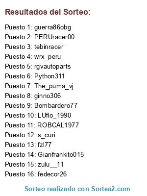 Lista de participantes: LUflo_1990, s_curi, Python311, PERUracer00, Bombardero77, fzl77, rgvautoparts, The_puma_vj, ginno306, zulu__11, fedecor26, ROBCAL1977, guerra86obg, wrx_peru, Gianfrankito015, tebinracer.