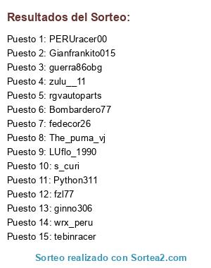 Lista de participantes: LUflo_1990, s_curi, Python311, Bombardero77, fzl77, PERUracer00, ginno306, rgvautoparts, The_puma_vj, fedecor26, zulu__11, guerra86obg, wrx_peru, Gianfrankito015, tebinracer.