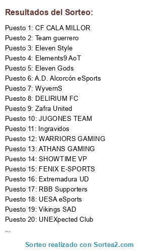 Lista de participantes: A.D. Alcorcón eSports, Columbus Pacers, Deportivo Alavés, Eleven Gods, Eleven Style, Extremadura UD, Imperium FC, JUGONES TEAM, LOSDEMARRAS FC, RBB Supporters, Team guerrero, UCAM eSports Club, UNEXpected Club, WARRIORS GAMING, ADCeuta eSports, ATHANS GAMING, Black knights, CF CALA MILLOR, DELIRIUM FC, DV7 ESOCCER, Elements9 AoT, FENIX E-SPORTS, Ingravidos, SHOWTIME VP, UESA eSports, Vikings SAD, WyvernS, Zafra United.