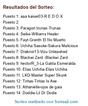 Lista de participantes: aaa kaiser03-R E D O X, Elias Uchiha-Elias Uchiha, Blackwi Zard -Blackwi Zard, hectorR_3-La Gatita Esmeralda, Athanielle-ojos de gaia, Uchiha Sasuke-Sakura Malicious, Paragon trunas-Trunas, Doddie-Lil Dr Dodie, Seike-Williams Healer, Draknor13-Vizu Unleashed, Tiritas-Tiritas Is Axe, LKD-Master Super Skunk, Fayt-Grenth El No Muerto, .