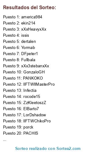 Lista de participantes: Infectia, MakMak, :Alvarolmc, LorDshadow, GonzaloGH, zHDemonCrasHz, xXxHeavyxXx, ekin214, america984, dertalen, ZzKleetoszZ, llFTWllChunChun, PANKOKO, PACHIS, issis, llFTWllMasterPro, AMADOMLL, porck, ElBarto7, Yormab, Fullbala, llFTWChikoPro, DFpeter1, xXx3stebanxXx, rocode15, diegostreet99.