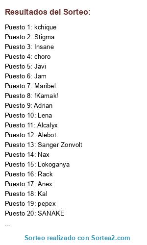 Lista de participantes: Neildark, Lena, Javi, Maribel, Nax, Rack, Insane, Alebot, Adrian, !Kamak!, Jam, Anex, Kal, Rooney., Alcalyx, SANAKE, choro, Sanger Zonvolt, pepex, Lokoganya, Tú amor kath, Merlin, kchique, Stigma.