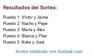 Lista de participantes: María y Álex, Víctor y Jaime, Blanca y Pilar, Koke y José, Nacho y Pepe.