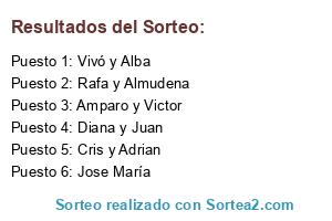 Lista de participantes: Diana y Juan, Cris y Adrian, Rafa y Almudena, Amparo y Victor, Vivó y Alba, Jose María.